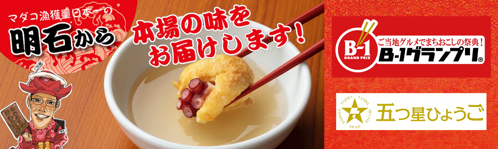 明石夢工房では、『あかし玉子焼(明石焼き)』などを他府県へ出張実演販売も行っています。また、2013年 には『冷凍あかし玉子焼(明石焼き)』の販売を始め、全国各地の皆様に、より便利に当店こだわりの『あかし玉子焼(明石焼き)』を召し上がっていただけるようになりました。